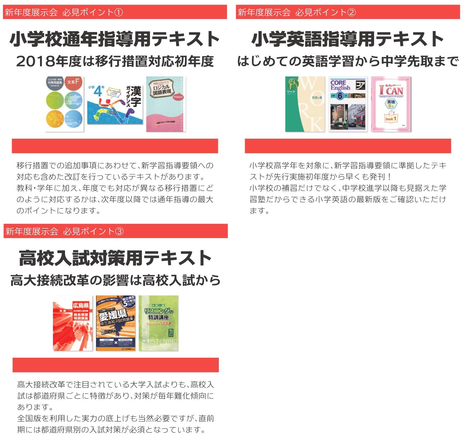エデュケーショナルネットワーク・文理・好学出版・学書・学友社・正進社・ 森の実出版・JES出版・都麦出版・CKT・廣済堂あかつき・学林舎・ JESDA・創育・旺文社・受験研究社・西北出版・学研・SPRIX 他